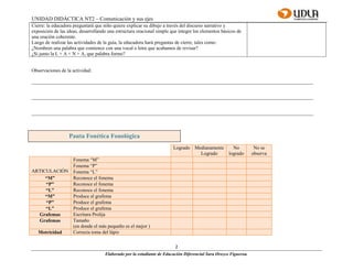 Este documento presenta una planificación de clase para el nivel NT2 en comunicación. El objetivo es que los estudiantes reconozcan que las palabras están formadas por fonemas como M, L, T, P junto con vocales que forman estructuras con significado. La actividad incluye el uso de láminas, presentaciones y videos para ayudar a los estudiantes a desarrollar la conciencia fonológica a través de la formación de palabras. La evaluación medirá el reconocimiento y producción de los fonemas y la escritura de grafem