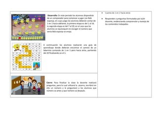 El resumen describe una lección de matemáticas para estudiantes de primer grado sobre contar números del 0 al 20 hacia adelante y hacia atrás. La lección usará una presentación para explicar el conteo, un juego interactivo en línea para practicar el conteo hacia adelante y una guía de trabajo para practicar el conteo hacia atrás. La maestra evaluará la comprensión de los estudiantes a través de preguntas orales.