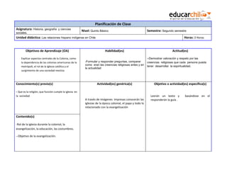 El documento presenta el plan de clase para una unidad sobre las relaciones hispano-indígenas en Chile. La lección se centra en explicar el rol de la Iglesia Católica durante el período colonial, incluyendo la evangelización, la educación y el cuidado de la fe. Los estudiantes aprenderán estos temas a través de lecturas y preguntas guiadas. Al final, reflexionarán sobre las similitudes y diferencias entre el rol de la Iglesia en la colonia y en la actualidad.