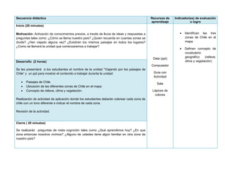 Este documento presenta una planificación de clase para una unidad didáctica sobre los paisajes de Chile dirigida a estudiantes de segundo básico. La unidad busca que los estudiantes reconozcan y clasifiquen los principales paisajes de Chile según su ubicación en las zonas norte, centro y sur, observando imágenes y utilizando vocabulario geográfico. La planificación describe los objetivos, contenidos, actividades y recursos a utilizar durante las 2 horas de clase.
