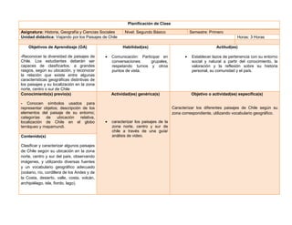 El documento presenta una planificación de clase para una unidad sobre los paisajes de Chile. Los objetivos son reconocer la diversidad de paisajes y clasificarlos según su ubicación en el norte, centro o sur del país. La clase introducirá los paisajes a través de imágenes y un video, y los estudiantes completarán una guía para caracterizar cada zona usando vocabulario geográfico. Al final, se evaluará si los estudiantes pueden aplicar este vocabulario para describir los paisajes de Chile.