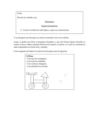La clase trata sobre figuras geométricas. La maestra presenta cubos, pirámides, prismas y esferas y pide a los estudiantes que identifiquen objetos similares. Luego muestra imágenes de figuras geométricas y sus nombres. Los estudiantes describen características de cada figura como elementos y lados. Usan un programa para formar figuras. Como actividad, identifican y colorean figuras en una hoja.