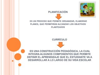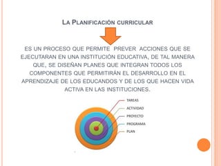 La planificación curricular es un proceso que permite prever acciones en una institución educativa para diseñar planes que integren todos los componentes necesarios para el desarrollo del aprendizaje de los estudiantes. La planificación curricular debe partir de las necesidades de los estudiantes, planificarse en relación al contexto social, involucrar problemas sociales de la época, y propiciar la reflexión y la acción adaptándose a la estructura cognoscitiva del estudiante y priorizando la selección de objetivos sobre contenidos.