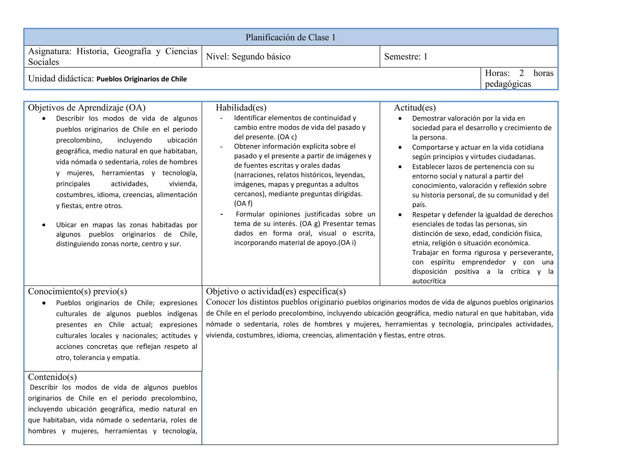 El plan de clase describe una lección de dos horas sobre los pueblos originarios de Chile para estudiantes de segundo básico. La lección se centrará en describir los modos de vida de los pueblos originarios precolombinos, incluyendo su ubicación, medio ambiente, estilo de vida, roles de género, tecnología, cultura y creencias. La clase comenzará con una activación de conocimientos previos, seguida de una presentación con información y preguntas. Finalmente, los estudiantes comentarán lo que más les llam