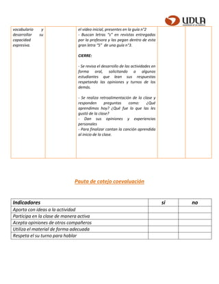 Este documento presenta el plan de clase para una lección de lenguaje y comunicación para estudiantes de primer año básico. La lección se centra en enseñar a los estudiantes sobre el fonema y grafema "S" a través de actividades de lectura, escritura y comunicación oral como identificar palabras que comienzan con "S", formar sílabas, y recitar canciones. La lección evalúa si los estudiantes pueden reconocer y aplicar correctamente el sonido y letra "S".