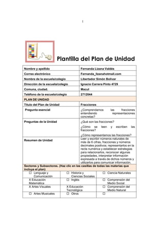 Este documento presenta un plan de unidad para la enseñanza de fracciones en tercer año medio. La unidad se centra en ayudar a los estudiantes a comprender las fracciones a través de representaciones concretas. Incluye objetivos, contenidos, actividades y materiales. Las actividades involucran presentaciones, ejercicios escritos, representaciones gráficas y un crucigrama. La unidad durará 3 semanas y requiere computadores, impresora y recursos en línea.