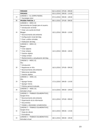 Este documento presenta el plan de estudios semestral para la asignatura de Informática en el cuarto nivel de la carrera de Medicina. La asignatura se dividirá en 6 unidades que cubren temas como la introducción a computadoras, herramientas web 2.0, trabajo colaborativo en Google Drive y aplicaciones de Microsoft Office. Habrá 54 clases que combinan lecciones, actividades virtuales y 3 pruebas parciales durante el período de octubre 2016 a marzo 2017.