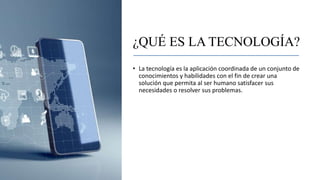 El documento proporciona información sobre conceptos básicos de tecnología y planificación de proyectos. Explica que la tecnología es la aplicación coordinada de conocimientos para resolver problemas humanos, y que la ciencia y la tecnología están relacionadas. También describe las fases de un proceso tecnológico, los documentos requeridos para un proyecto, y los impactos ambientales asociados con los materiales tecnológicos.