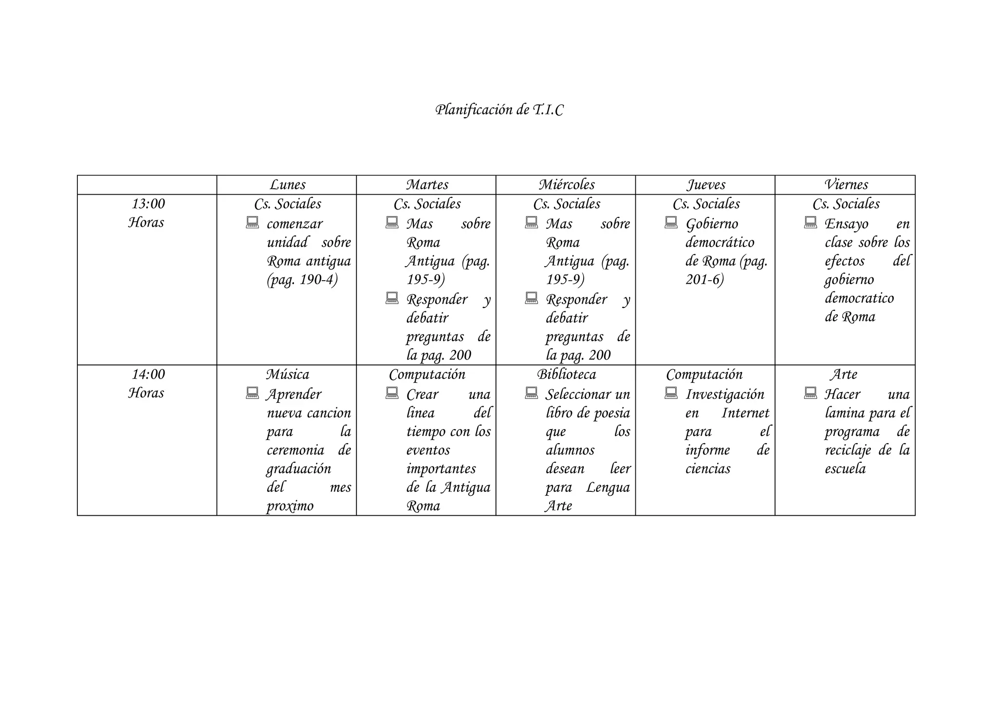El documento presenta el horario semanal de una clase de estudios sociales. La primera mitad de la semana se centra en la antigua Roma, incluyendo lecciones sobre Roma antigua, gobierno democrático y debates. La segunda mitad de la semana incluye música, computación, biblioteca y arte.