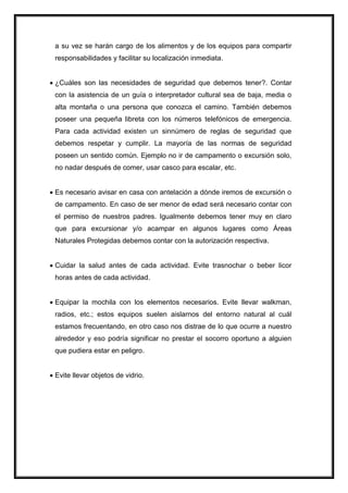 Para planificar exitosamente un campamento o excursión al aire libre, es necesario establecer detalles como la fecha, ubicación y actividades; asegurarse de contar con el equipamiento y vestimenta adecuados para las condiciones; y considerar aspectos de seguridad como contar con primeros auxilios, números de emergencia y avisar a otros sobre los planes. La planificación debe hacerse con anticipación para organizar responsabilidades como la comida y equipo, y asegurar un desarrollo seguro de la actividad al aire libre.