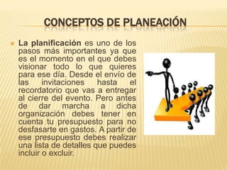El documento proporciona información sobre la planificación de eventos. Explica que la planificación es una etapa crucial que involucra aspectos como el presupuesto, la lista de tareas, el cronograma y la selección del espacio para el evento. También brinda definiciones de términos relacionados con el turismo y la hotelería para apoyar la organización del evento.