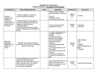 Este documento presenta una planificación diagnóstica para el campo formativo de Lenguaje y Comunicación. Incluye competencias, aprendizajes esperados, fechas de actividades, formas de evaluación y recursos necesarios. Las actividades se enfocan en el uso del lenguaje, la narración de eventos, la toma de acuerdos, y la apreciación de la diversidad lingüística. Las evaluaciones incluyen listas de cotejo y las actividades utilizan cuentos, videos y juegos didácticos.