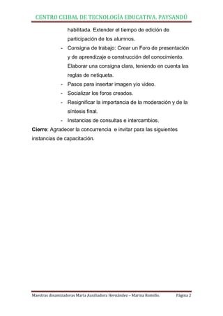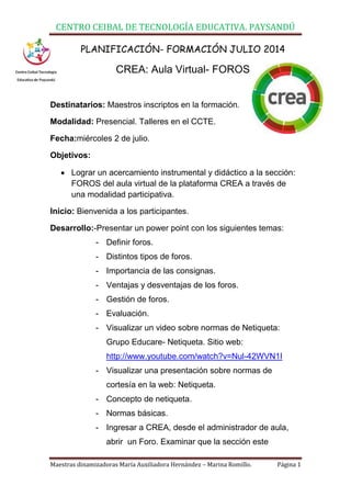 Este documento presenta la planificación de una formación sobre el uso de foros en el aula virtual CREA. La capacitación se llevará a cabo mediante talleres presenciales en el Centro Ceibal de Tecnología Educativa en Paysandú, Uruguay. El objetivo es lograr un acercamiento instrumental y didáctico a la sección de foros, presentando conceptos clave, ventajas y desventajas, y realizando ejercicios prácticos como la creación de un foro de presentación siguiendo las normas de net