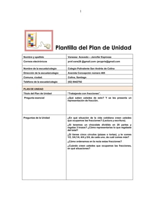 Este documento presenta un plan de unidad para enseñar fracciones a estudiantes de 4° básico. El plan incluye el título de la unidad, las preguntas centrales, un resumen de los contenidos que se abordarán en cada clase, los aprendizajes esperados, los contenidos curriculares, las actividades propuestas y los materiales necesarios. El plan consiste en 4 clases que abordan la representación, lectura, escritura, ordenación y cálculo con fracciones.