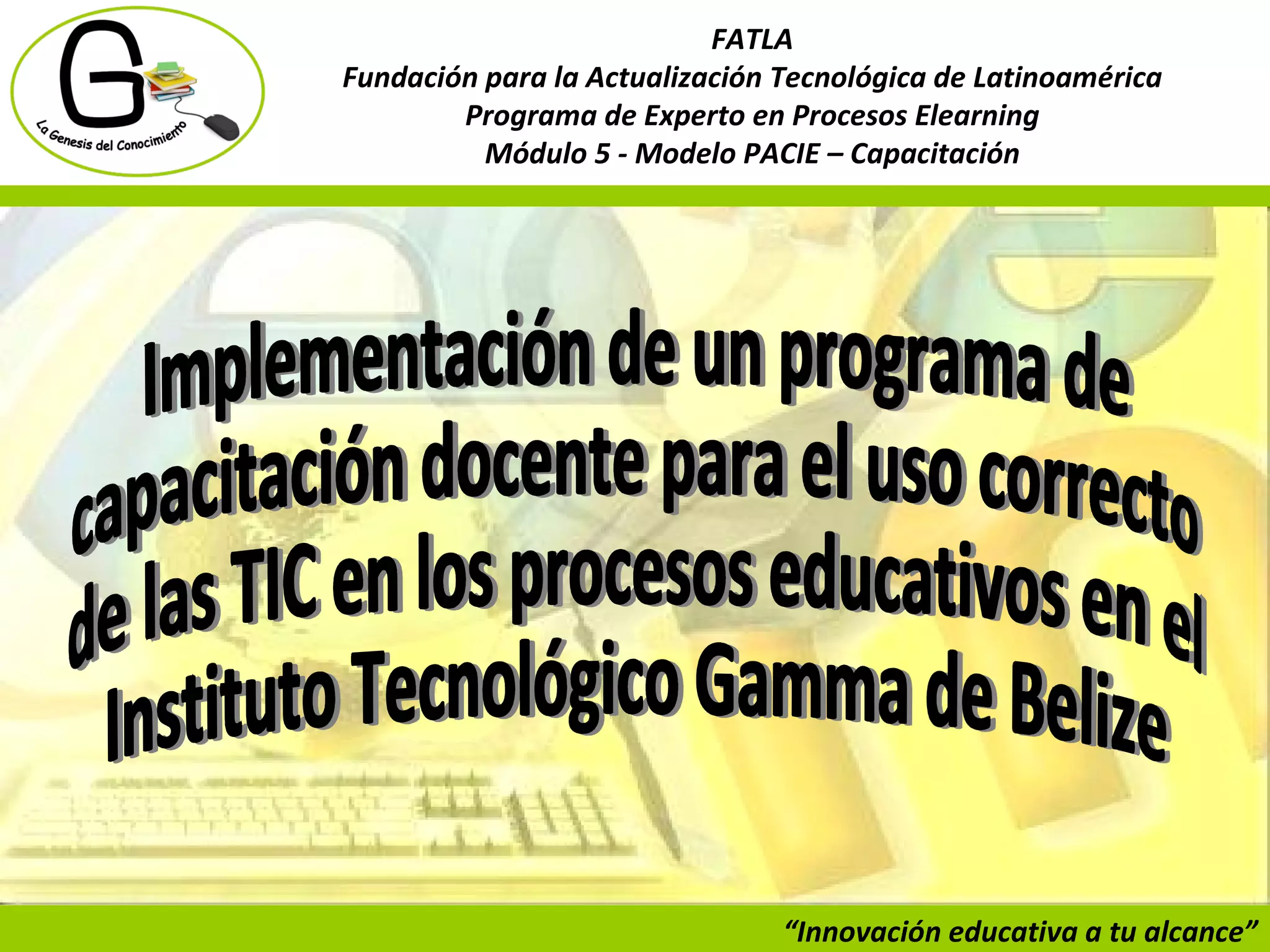 El documento presenta un proyecto para implementar un programa de capacitación docente en el uso de las TIC para los profesores del Instituto Tecnológico Gamma en Belice. El programa se implementaría usando la metodología PACIE y tendría como objetivo capacitar a los 90 profesores de la institución en el uso educativo de las herramientas tecnológicas en un plazo de 10 meses.