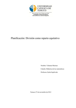 El documento presenta un plan de clase para enseñar la división a estudiantes de 3o básico. La lección se centra en demostrar que los estudiantes comprenden la división como un reparto equitativo en partes iguales. La clase incluye actividades para activar conocimientos previos, analizar el concepto de división, resolver problemas usando material concreto y validar el aprendizaje al final a través de preguntas. La evaluación consta de una pauta de cotejo para revisar la comprensión de los estudiantes sobre el