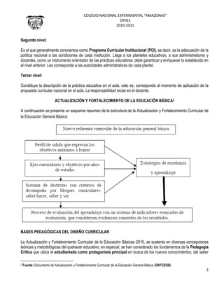 Este documento describe los tres niveles de concreción curricular y los componentes clave de la Actualización y Fortalecimiento Curricular de la Educación General Básica en Ecuador. Explica que el primer nivel es la política educativa nacional establecida por el Ministerio de Educación, el segundo nivel es la adaptación de esa política a cada institución educativa, y el tercer nivel es la implementación del currículo en el aula. También resume los fundamentos pedagógicos, la estructura curricular, y componentes como el perfil de salida, objetivos