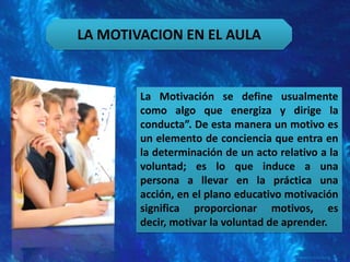 El documento describe diferentes métodos para motivar a los estudiantes en el aula, incluyendo dar respuestas positivas y oportunidades para el éxito, crear una atmósfera abierta y positiva, y ayudar a los estudiantes a sentirse valorados. También describe una clase participativa con tres fases: inicio para motivar e interesar a los estudiantes, desarrollo para promover la interacción y análisis, y cierre para establecer conexiones y evaluar el aprendizaje. Finalmente, incluye una lista de asignatur