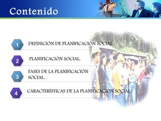 La planificación social es el uso de teorías y métodos de planificación para un sistema social que consiste en infraestructura material, estructura social y superestructura. Tiene varias fases como planeamiento, preparación, ejecución y evaluación. Sirve para minimizar la incertidumbre ante falta de información válida. Los consejos comunales permiten que la comunidad formule, ejecute, controle y evalúe políticas públicas. La contraloría social controla de manera organizada la gestión gubernamental para transparencia y honradez.