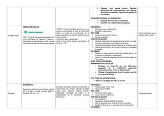 La planificación semanal incluye objetivos de aprendizaje en lengua y literatura, ciencias naturales, matemáticas y estudios sociales. Se presentan contenidos esenciales, destrezas, indicadores de evaluación, estrategias metodológicas y actividades evaluativas para cada área. Las actividades propuestas buscan desarrollar habilidades comunicativas, conocimientos sobre el sistema solar, operaciones numéricas con decenas y características de la localidad de los estudiantes.