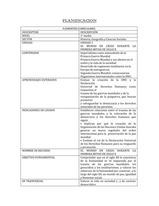 Este documento presenta la planificación de una unidad didáctica sobre el mundo en crisis durante la primera mitad del siglo XX. La unidad aborda temas como el imperialismo, las guerras mundiales, los regímenes totalitarios y la creación de organismos internacionales como la ONU. Los estudiantes desarrollarán un blog sobre estos temas y evaluarán el rol de la Declaración Universal de los Derechos Humanos. La unidad utiliza videos y trabajo en internet para motivar a los estudiantes e incorporar las TIC de manera significativa.