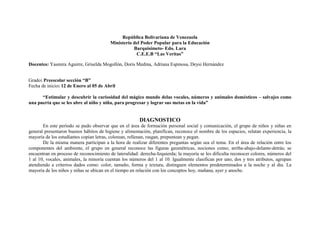 El documento describe un plan de estudios para preescolares enfocado en el desarrollo de habilidades de lectura, escritura y matemáticas. El plan incluye objetivos, estrategias, actividades y recursos para enseñar sobre vocales, números, animales domésticos y salvajes a lo largo de un período de tres meses.