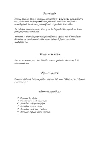 Este documento presenta un método llamado "Aprende a leer con Pipo" para enseñar a niños a leer de forma lúdica e interactiva utilizando un CD. El método busca que los niños reconozcan silabas y aprendan sobre letras a través de 14 juegos. Se propone aplicar el método una vez por semana durante 30 minutos con actividades en el laboratorio de computación y el aula para reforzar los aprendizajes.