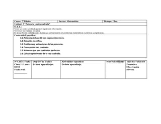 Este documento presenta la planificación de clases de matemáticas para las semanas 28 a 31. Incluye objetivos de aprendizaje, contenidos como potencias, raíces cuadradas, álgebra y ecuaciones, y actividades como explicaciones del profesor, resolución de ejercicios y evaluaciones. La última clase consistirá en una prueba parcial sobre los contenidos vistos.