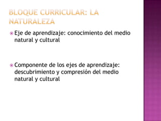 Este documento presenta información sobre un bloque curricular de literatura sobre la naturaleza. Incluye ejes de aprendizaje sobre el conocimiento del medio natural y cultural, así como sobre la comunicación verbal y no verbal a través de la expresión corporal. Detalla destrezas para reconocer animales y imitar sus movimientos, e incluye una comparación de destrezas e indicadores de evaluación. Finalmente, presenta una rima y una adivinanza sobre un conejo.