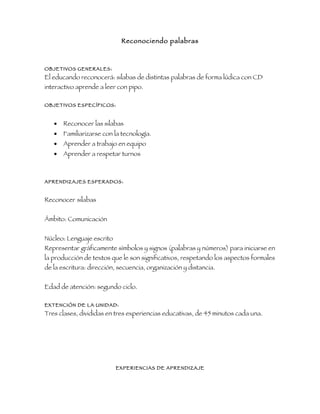 El documento describe una unidad educativa de tres clases para enseñar a niños de segundo ciclo a reconocer silabas utilizando el software interactivo "Aprende a leer con Pipo". Los objetivos son reconocer silabas, familiarizarse con la tecnología, trabajar en equipo y respetar turnos. Las tres experiencias educativas consisten en recorrer un mapa de letras reconociendo silabas, agrupar y separar silabas de palabras, y una evaluación para verificar si los niños pueden reconocer silabas.