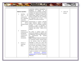 El documento presenta la planificación de la primera clase sobre la subunidad de Imperialismo. La clase tendrá tres partes: en la introducción, el profesor presentará el tema e identificará conceptos clave; luego explicará las causas del imperialismo europeo y el avance territorial mediante mapas; finalmente analizará los sistemas de ocupación colonial y las consecuencias del imperialismo. La evaluación será formativa a través de preguntas.