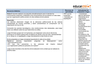 Este documento presenta la planificación de una clase sobre la civilización azteca para estudiantes de 4o básico. La clase comparará la organización política y social azteca con la actual, e incluirá actividades como observar imágenes de la estructura política azteca, conocer sus avances tecnológicos, y representar aspectos de la vida cotidiana azteca a través de dibujos y dramatizaciones. El objetivo es que los estudiantes describan elementos de la organización política azteca y comprendan cómo era la vida en su imper