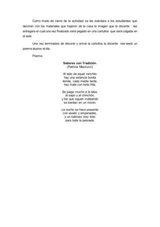 Este documento describe una actividad escolar para el Día de la Tradición en un quinto grado. Los objetivos son que los estudiantes reconozcan y expresen sus sentimientos sobre los elementos tradicionales de Argentina. En la actividad, los estudiantes compartirán recetas y objetos tradicionales de sus casas y decorarán una imagen representando la tradición. El cierre incluye la lectura de un poema sobre los sabores tradicionales de Argentina.