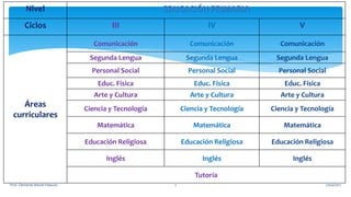 El documento presenta el plan de estudios y horario referencial de clases para los grados de educación primaria de los ciclos III, IV y V. Incluye 1) las áreas curriculares y horas semanales dedicadas a cada una, 2) el horario de clases detallado por día de la semana, y 3) una breve descripción de los elementos del currículo nacional, plan de mejora continua institucional y programación curricular anual.
