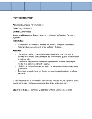 Este documento presenta una lección sobre textos literarios dirigida a estudiantes de segundo básico. La lección se enfoca en las leyendas y busca que los estudiantes desarrollen habilidades como comprender secuencias de eventos y distinguir entre realidad y fantasía. El objetivo es identificar y reconocer una leyenda. La lección incluye actividades como analizar conocimientos previos sobre leyendas a través de un video, escuchar una leyenda contada por el docente e identificar sus elementos, y dibujar y presentar una leyenda prop