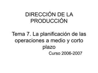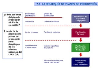 El documento aborda la planificación de operaciones a medio y corto plazo en producción, destacando la jerarquía de planes de producción y los procesos de planificación y programación. Se enfatiza la planificación agregada para optimizar costos y satisfacer la demanda, junto con la elaboración de un plan maestro que respete plazos y restricciones de capacidad. Además, se trata de la planificación a muy corto plazo, que implica la programación de operaciones, el control de procesos y la secuenciación de trabajos para maximizar la eficiencia.
