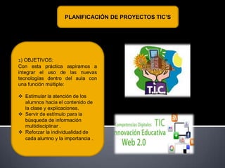 El documento describe el proceso de planificación de proyectos TIC en el aula. Se deben tomar decisiones curriculares, pedagógicas y tecnológicas. Las decisiones curriculares están determinadas por la legislación educativa, las pedagógicas se basan en el enfoque didáctico adoptado, y las tecnológicas dependen del conocimiento sobre las herramientas TIC y cómo aplicarlas en la enseñanza.