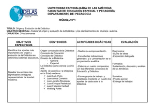 Este documento presenta un plan de estudios para la carrera de Estimulación Temprana y Orientación Familiar. Consiste en cuatro módulos que abarcan temas como el origen y evolución de la didáctica, el proceso de enseñanza-aprendizaje, los métodos didácticos y las técnicas de enseñanza. Cada módulo contiene objetivos, contenidos, actividades y formas de evaluación. El plan busca que los estudiantes comprendan conceptos clave de la didáctica y puedan aplicar diferentes