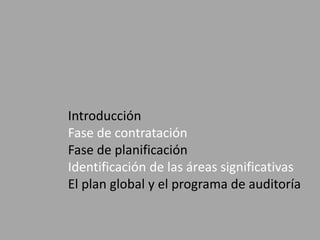 1. La fase de planificación de la auditoría requiere que el auditor comprenda y conozca la entidad auditada, los procedimientos contables que aplica y el grado de fiabilidad de su control interno. 2. También requiere realizar una revisión analítica preliminar para identificar las áreas más significativas y asignar los recursos adecuados. 3. El programa de auditoría debe especificar los procedimientos de auditoría y el momento de su realización.