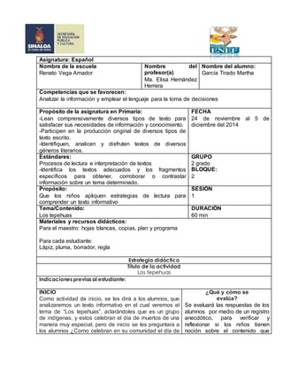 Este documento presenta una lección sobre la cultura de los tepehuas para estudiantes de segundo grado. La lección incluye una lectura sobre las tradiciones y costumbres de los tepehuas y actividades como preguntas sobre el texto y la creación de dibujos para compartir la información. El objetivo es que los estudiantes comprendan el contenido del texto y aprendan sobre la cultura tepehua.