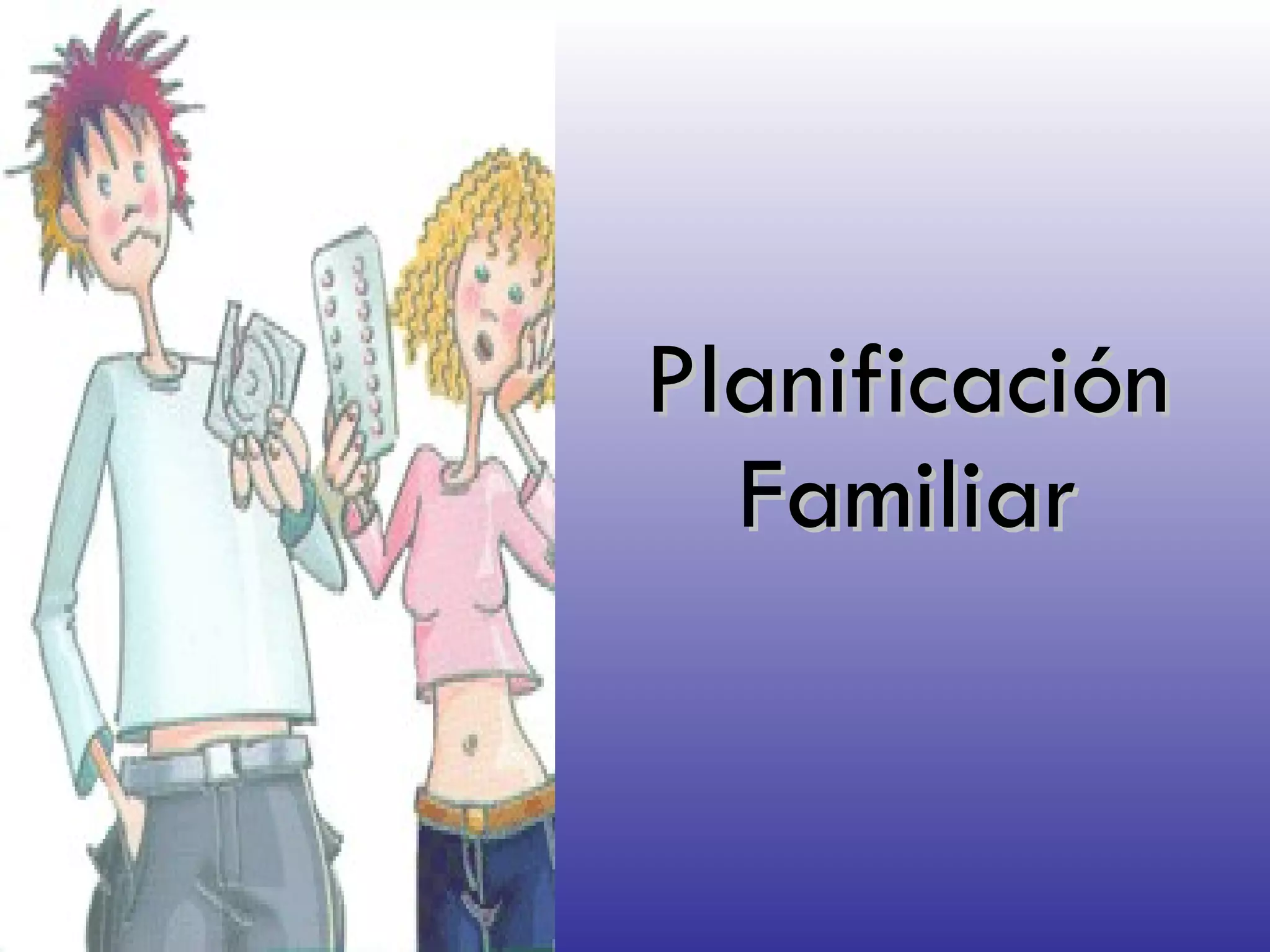 El documento trata sobre planificación familiar. Define la planificación familiar como una acción prioritaria de salud reproductiva que asegura a las personas la posibilidad de decidir libre y responsablemente sobre el número y espaciamiento de hijos. Explica los objetivos y métodos de planificación familiar, incluyendo métodos reversibles e irreversibles como anticonceptivos orales, inyectables, DIU y esterilización.