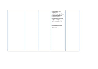 Este documento presenta una unidad didáctica sobre tipos de animales y su hábitat, enfocándose en invertebrados como insectos, arácnidos y crustáceos. El objetivo es que los estudiantes observen, describan y clasifiquen las características de los animales sin columna vertebral e identifiquen las similitudes y diferencias con los vertebrados. Las estrategias metodológicas incluyen el uso de herramientas tecnológicas como fotografías y presentaciones para describir los animales, así como j