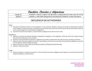 Este documento describe tres sesiones de una clase de formación ciudadana para estudiantes de sexto grado sobre derechos y obligaciones. En cada sesión, los estudiantes participan en dinámicas y discusiones grupales para explorar y comprender mejor sus derechos y obligaciones como niños en la escuela y en casa. También analizan historias, videos y fuentes bibliográficas sobre este tema. Al final de cada sesión, los estudiantes completan actividades como cuadros, mapas mentales y carteles para promover el cumplimiento de