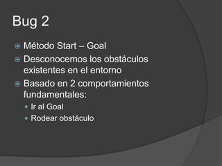 Este documento describe un algoritmo para la planificación de trayectorias de un robot llamado Bug 2. El algoritmo genera una línea recta entre los puntos de inicio y objetivo, y el robot la seguirá salvo que encuentre un obstáculo, en cuyo caso lo rodeará hasta volver a la línea. Se proporcionan detalles sobre la implementación en Player/Stage, incluyendo los archivos de configuración y mundo necesarios. El código calcula la pendiente y ángulo de la línea recta, y usa sensores sonar y bucles para moverse, rodear obst