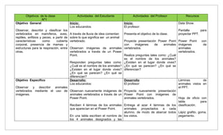 El documento describe una clase sobre los vertebrados. La clase tiene dos objetivos: 1) Observar, describir y clasificar los vertebrados en mamíferos, aves, reptiles, anfibios y peces. 2) Identificar, procesar y sintetizar información sobre los grupos de vertebrados. Las actividades incluyen observar imágenes de vertebrados, describir sus características, clasificar animales en una tabla y pegarla en el cuaderno. El profesor guía las discusiones y presenta la información a través de PowerPoint.
