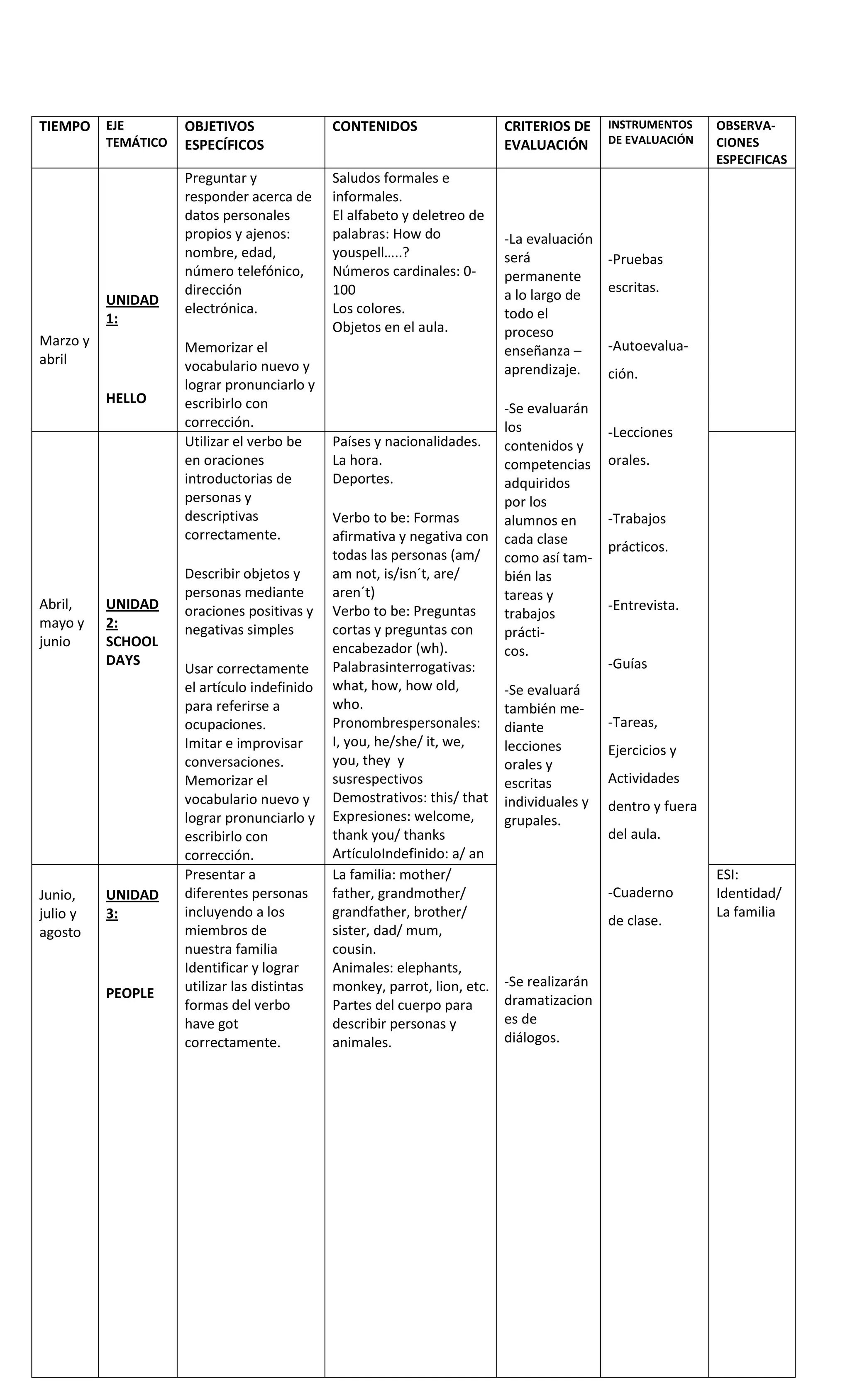 Este documento presenta el plan anual de la asignatura de Lengua Extranjera (Inglés) para el primer año de la escuela secundaria No 5076 "Dr. Arturo Illia". El plan describe los objetivos generales y específicos, los contenidos temáticos, los criterios y los instrumentos de evaluación para cada uno de los cuatro trimestres. Las unidades abarcan temas como saludos, la escuela, las personas, el tiempo libre y las actividades recreativas. El plan busca desarrollar las habilidades comunicativas de los estudiant