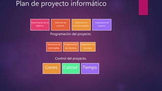 El documento describe los pasos clave para planificar un proyecto informático, incluyendo la determinación de objetivos, definición del proyecto, recursos necesarios, organización, secuencia de actividades, programación de recursos, asignación de recursos, costos, calidad y tiempo. También destaca la importancia de establecer fechas límite para comprender y visualizar mejor el proyecto, descomponerlo en fases y establecer un marco de tiempo para cada una.