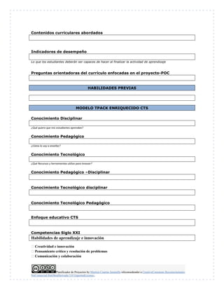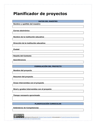 Este documento presenta un planificador de proyectos educativos que incluye secciones para la formulación del proyecto, planificación curricular, habilidades previas, modelo pedagógico TPACK enriquecido con enfoque CTS, estrategias motivacionales, metodología, evaluación formativa, oportunidades de aprendizaje diferenciadas, productos del proyecto y sistematización. El planificador está diseñado para guiar el desarrollo e implementación de proyectos educativos y está licenciado bajo Creative Commons.
