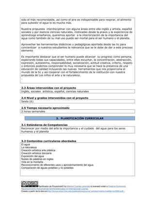 El documento describe un proyecto educativo sobre el agua y la naturaleza para estudiantes de sexto grado. El proyecto abordará temas relacionados con el agua, la naturaleza y el arte a través de diferentes áreas como inglés, sociales y ciencias naturales. El objetivo es concientizar a los estudiantes sobre la importancia del agua y su cuidado a través de actividades artísticas y el uso de herramientas tecnológicas.