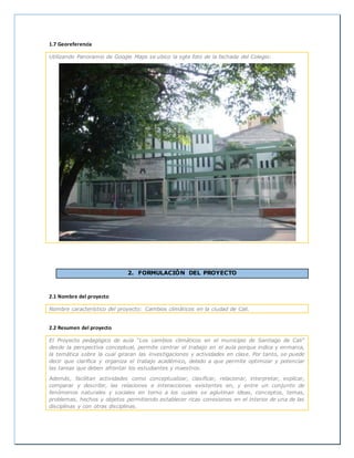 El proyecto tiene como objetivo analizar los cambios climáticos en la ciudad de Cali a través del uso de herramientas tecnológicas. Aborda este tema desde diferentes áreas como ciencias naturales, ciencias sociales e inglés para grados sexto y octavo. Incluye salidas pedagógicas, consultas en internet, videos y presentaciones sobre el clima. Los estudiantes aprenderán a recolectar y procesar información usando herramientas ofimáticas para comprender y proponer soluciones a problemas ambientales.